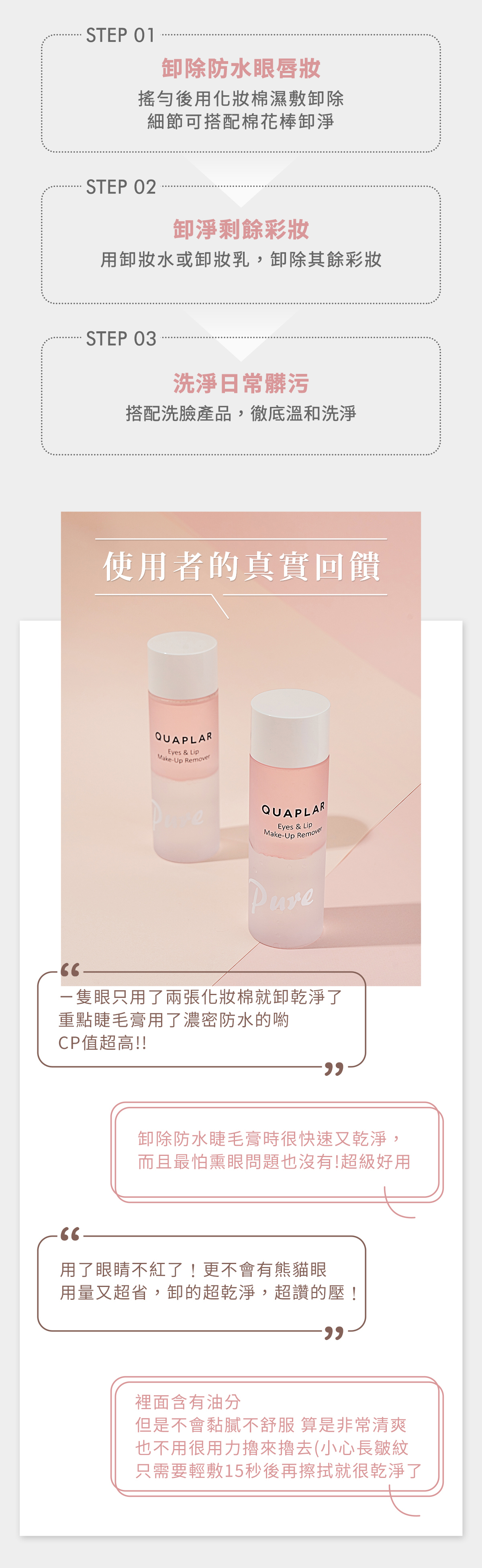 用法:使用前搖勻,以化妝棉沾取適量,濕敷於眼部或唇部,停留數秒待彩妝溶解後輕輕擦拭即可。