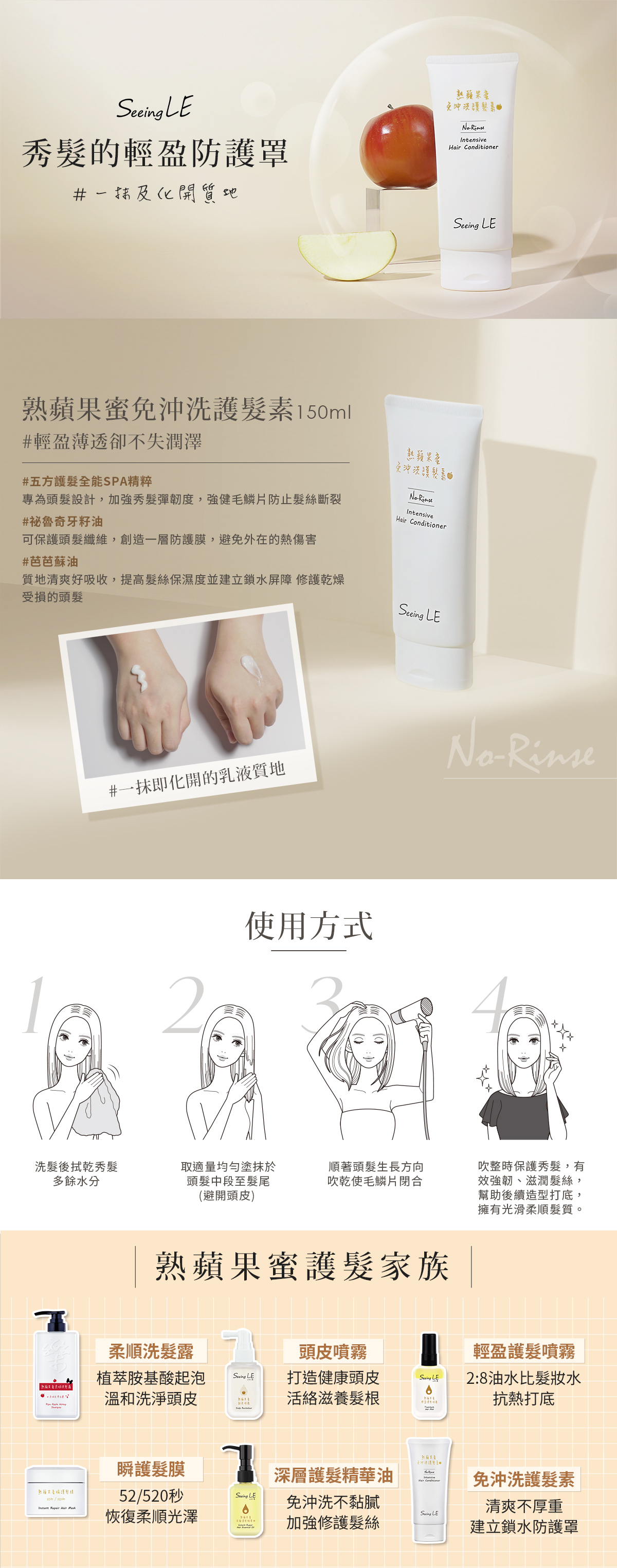 用法:洗髮後,取適量均勻塗抹於頭髮中段至髮尾(避開頭皮)吹乾頭髮即可。