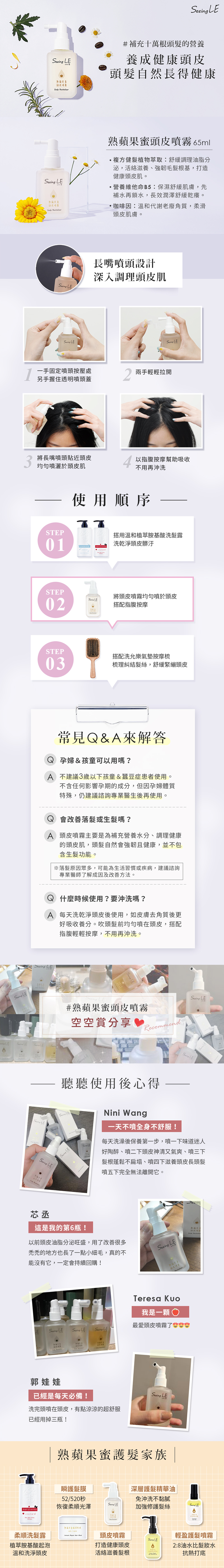 用法:頭皮洗淨後,吹髮前使用於頭皮處,一手固定噴頭按壓處,另一手握住透明噴頭蓋,兩手輕輕拉開,均勻噴於頭皮並以指腹輕輕按摩,再使用吹風機吹乾頭髮即可。