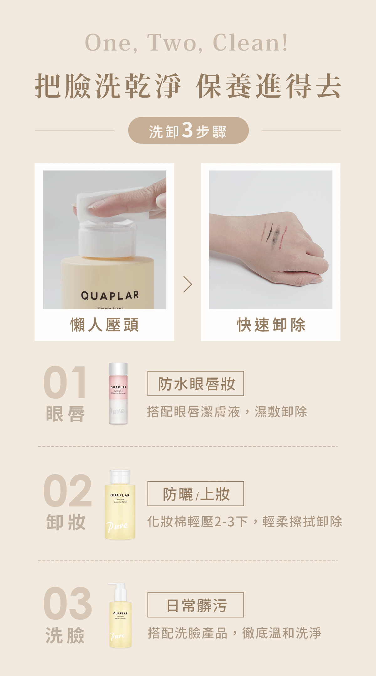 用法:取化妝棉於壓頭按取適量,輕輕擦拭全臉以卸除彩妝及髒污。