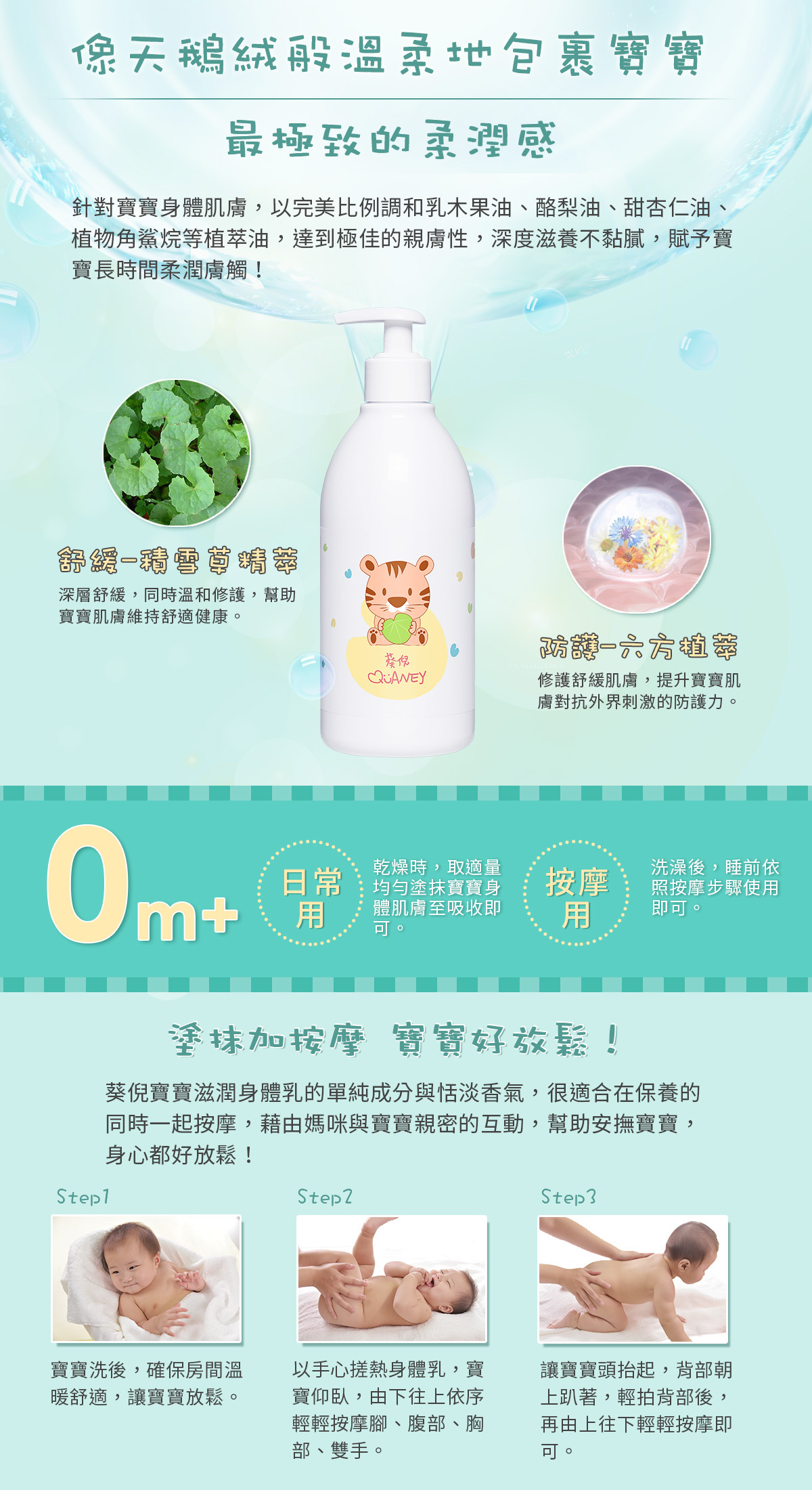 用法:寶貝洗澡後,直接塗抹於全身肌膚,保持肌膚柔嫩滑彈不乾燥,亦可幫新生寶寶做按摩,多做親子肌膚接觸,能安撫寶寶情緒使寶寶放鬆更容易入睡。