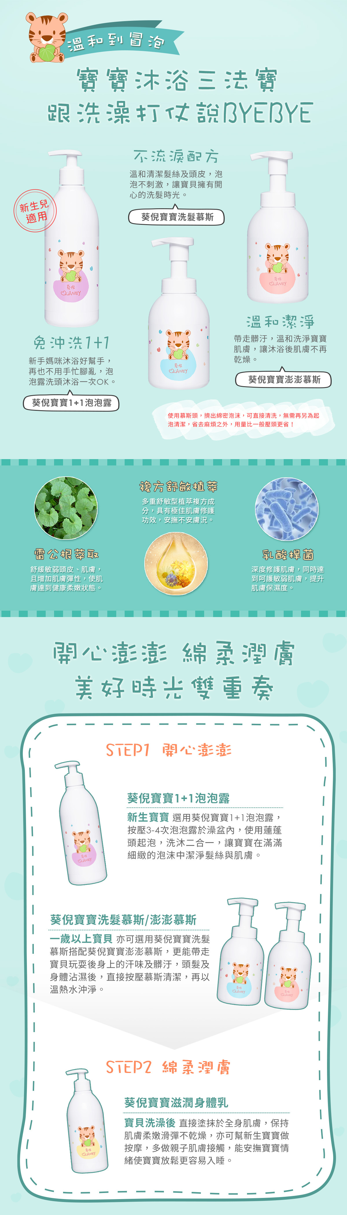 用法:直接按壓慕斯清潔,再以溫熱水沖淨,慕斯頭更便捷,不流淚配方再也不害怕洗澡洗頭。